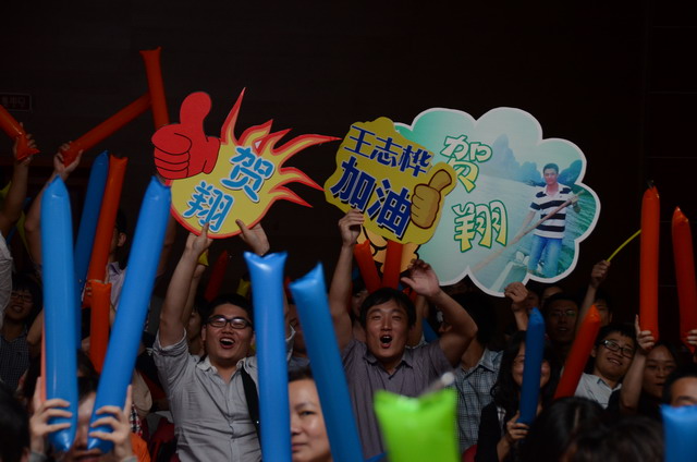 在激揚(yáng)的歌曲聯(lián)唱《五月的花?!分?,歌唱比賽正式開(kāi)始。16名選手按組別輪流登場(chǎng),現(xiàn)場(chǎng)精彩萬(wàn)分。歌聲或激蕩高昂,或宛轉(zhuǎn)悠揚(yáng),或徐徐如風(fēng),或渾厚有力;表現(xiàn)力或動(dòng)感十足,或動(dòng)靜相宜,或幽靜宜人;曲風(fēng)各異,或熱辣奔放,或溫暖抒情,或自然歡快,或懷舊悠揚(yáng)。啦啦隊(duì)陣容也不容小覷,加油牌、口哨、熒光棒一應(yīng)俱全,或歌唱伊始吶喊助威,或伴隨著歌聲興奮地?fù)]舞著手臂,更有甚者激動(dòng)地走到臺(tái)上為選手喝彩,臺(tái)上臺(tái)下照相印襯、融為一體。期間,軍企拉歌、擊鼓傳花等活動(dòng)環(huán)節(jié)也將比賽推向一個(gè)又一個(gè)高潮。