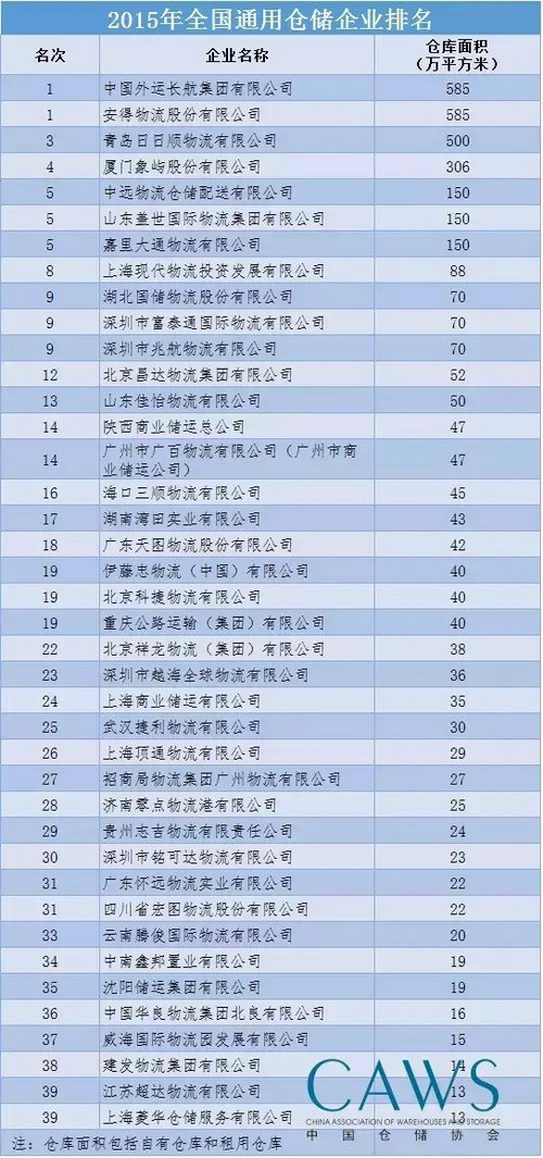該榜單由中國倉儲協(xié)會根據(jù)企業(yè)自愿申報和調查掌握的行業(yè)數(shù)據(jù),以2015年底企業(yè)自有和租用倉庫設施的總規(guī)模為依據(jù),共排出全國倉儲企業(yè)100強,其中包括“通用倉儲企業(yè)40強”、“倉儲地產企業(yè)10強”、“冷藏倉儲企業(yè)30強”、“?;穫}儲企業(yè)10強”和“?;穬奁髽I(yè)10強”。