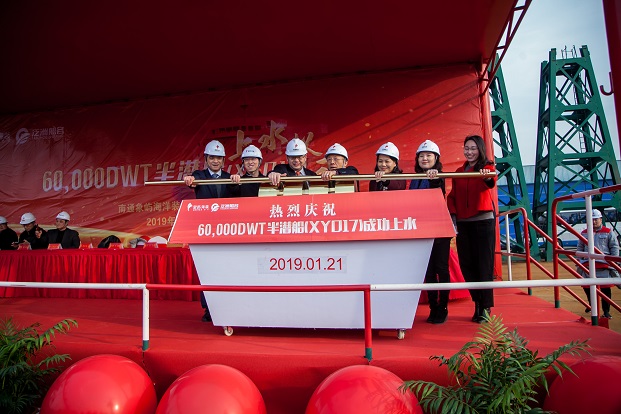 1月21日,由南通象嶼海洋裝備有限責(zé)任公司(以下簡稱“象嶼海裝”)建造的60,000DWT半潛船順利出塢。江蘇泛洲船務(wù)有限公司董事長江厥杰、中國科學(xué)院自動化研究所軍事顧問原海軍訓(xùn)練基地副司令員張錦榮、江蘇省交戰(zhàn)辦主任林有鎮(zhèn)、南京交通運(yùn)輸局局長徐衛(wèi)國、中國船級社江蘇分社副總經(jīng)理張東標(biāo)、象嶼集團(tuán)黨委委員、象嶼股份黨委書記、總經(jīng)理、象嶼海裝董事長鄧啟東等共計(jì)200多名各界人士參加了象嶼海裝60,000DWT遠(yuǎn)洋自航半潛船上水儀式。