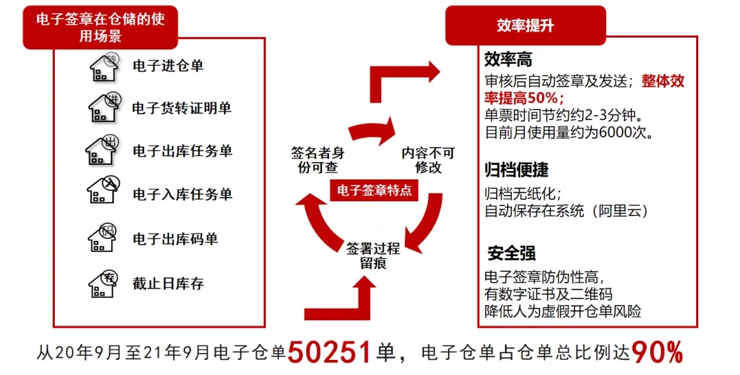 改變紙質倉單上“蘿卜章”層出不窮、倉單真實性難以核實,單據(jù)流轉效率低的弊病,引入電子簽約平臺,實現(xiàn)全單據(jù)流轉數(shù)字化,保障倉單內容及簽署方真實性和可溯源,流轉效率和可信度大幅提升,整體效率提高了50%。