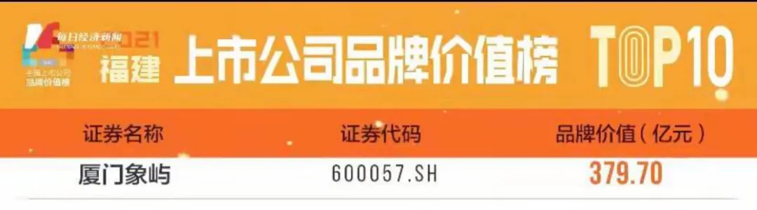 近日,由每日經(jīng)濟(jì)新聞主辦的“2021中國上市公司品牌價(jià)值藍(lán)皮書發(fā)布暨中國資本市場年度榮譽(yù)盛典”成功舉辦。廈門象嶼繼此前入圍“2021中國上市公司品牌價(jià)值活力榜TOP 100”后,再次入圍“2021福建上市公司品牌價(jià)值榜TOP 10”,品牌價(jià)值高達(dá)379.70億元,同時(shí)公司董事會(huì)秘書廖杰榮獲“2021最佳主板上市公司董秘”。
